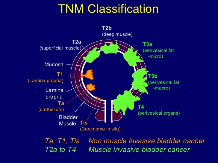 PPT - TNM BLADDER CANCER STAGING PowerPoint Presentation ... from image1.slideserve.com Find more information about bladder cancer, the bladder cancer is the growth of abnormal or cancerous cells on the inner lining of the bladder wall. If you have any questions about your stage, please ask your doctor to explain it to you in a way you understand. Tumor goes past the muscle layer into tissues around the bladder.